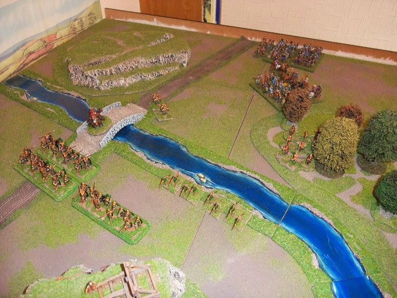 | The British warbands lie in wait as Paullinus (Glenns) legions clear the hill and move to the centre crossing point. This will be a tough fight on the river. |
